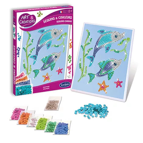 Šie delfinai sublizgės tūkstančiu spalvų dėka 6 spalvų blizgučių, kuriuos rasite šioje stebuklingoje dėžutėje. Galėsi pagaminti spinduliuojančius ir įvairiaspalvius paveiksliukus iš daugybės blizgučių, kuriuos reikia pritvirtinti su smeigtukais prie specialios kartoninės lentutės. Tai ypatingai smagi ir kūrybinga veikla kurianti daug blizgesio ir džiugesio
