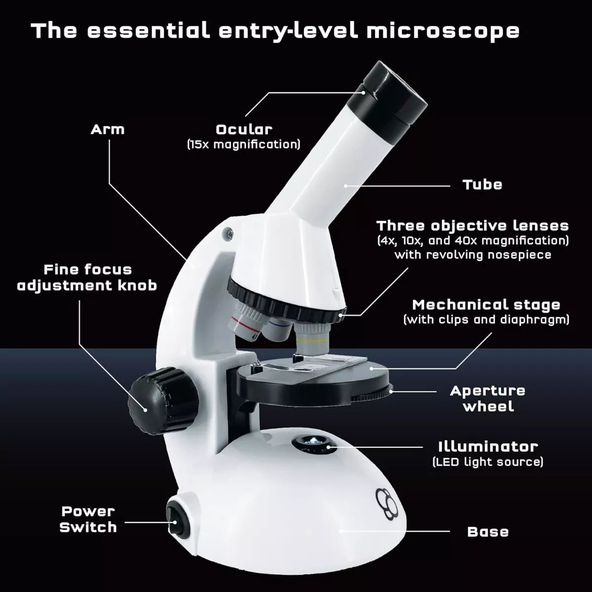 Pradėkite savo kelionę mokydamiesi naudotis mikroskopu ir tyrinėdami tris jau paruoštus pavyzdžius stikleliuose. Vėliau, pasitelkę gausų 45 priedų rinkinį, išmokite patys rinkti ir paruošti savo pavyzdžius stebėjimui po mikroskopu. Mikroskopas pasižymi galingu didinimu iki 600 kartų (60x, 150x, 600x) , kurį užtikrina 15x okuliaras ir trys objektyvo lęšiai. Jūsų pavyzdžius ryškiai apšvies baterijomis maitinama LED lemputė.