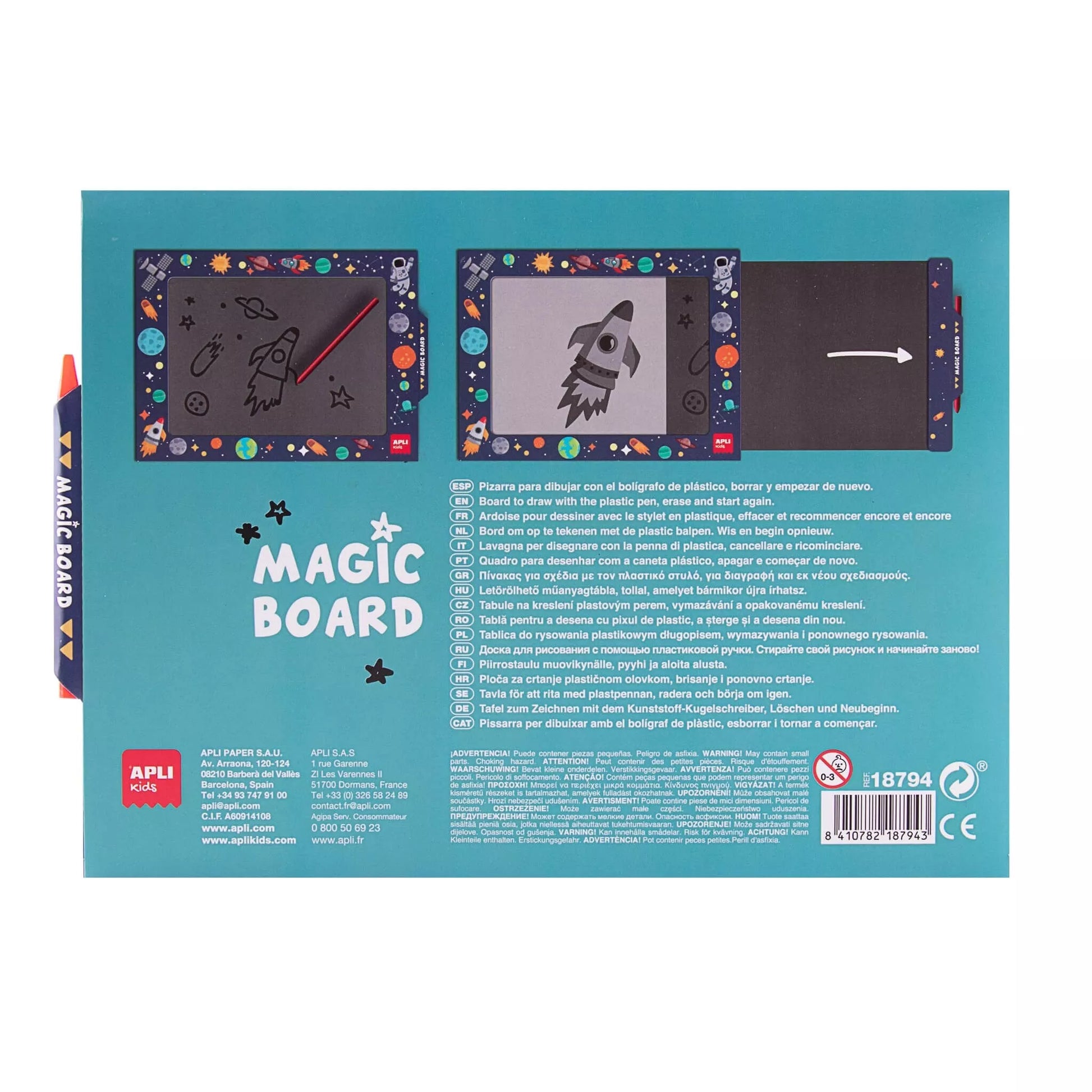 Stebuklinga piešimo lenta, kurią galėsite naudoti vėl ir vėl ir vėl! Tiesiog pieškite ant jos su specialiu pridėtu plastmasiniu pieštuku, ištrinkite ištraukdami įmontuotą kartoną ir vėl įdėkite jį, kad galėtumėte piešti iš naujo. Tegu mažieji dailininkai pasiima šią stebuklingą piešimo lentą visur, kur bekeliautų. Išmatavimai: 26 x 16 cm.