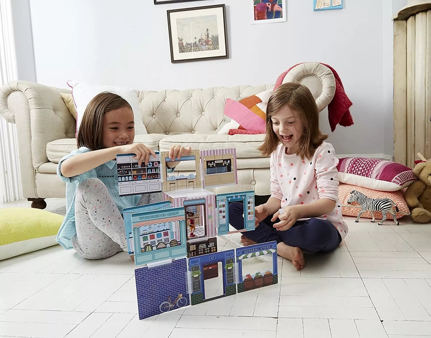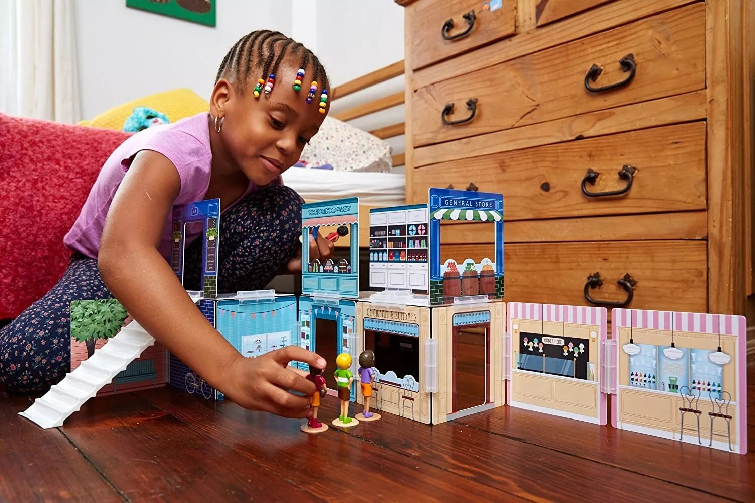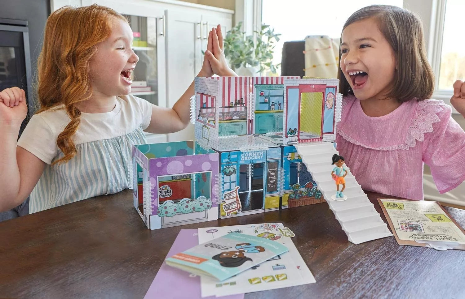 Su Wonderhood rinkiniu "Corner Shops" vaikai gali pastatyti savo unikalią miesto centro prekybos zoną. Ledų parduotuvėlė, saldumynų kioskelis, universalių prekių parduotuvė ir daugybė kitų prekybos vietų leis pasinerti į spalvingą kūrybinį žaidimą. 16 nuostabiai iliustruotų scenų, atspausdintų ant dvipusių, blizgaus plastiko skydelių, gali būti sudėliojamos pačiomis įvairiausiomis kombinacijomis: tiesiog sujunkite scenas kartu naudodamiesi patvariomis plastikinėmis jungtimis. Kiekvienas Wonderhood rinkinys atkeliauja kartu su veiklų žurnalu, pripildytu istorijų ir smagiais architektūriniais iššūkiais, kviečiančiais vaikus išbandyti savo problemų sprendimo gebėjimus. Sujungę šį rinkinį su kitais Wonderhood rinkiniais, galėsite sukurti visą miestą! Baigę statyti galėsite žaisti valandų valandas, o tuomet viską išardyti ir kitą kartą sukurti visai kitokį architektūrinį šedevrą.